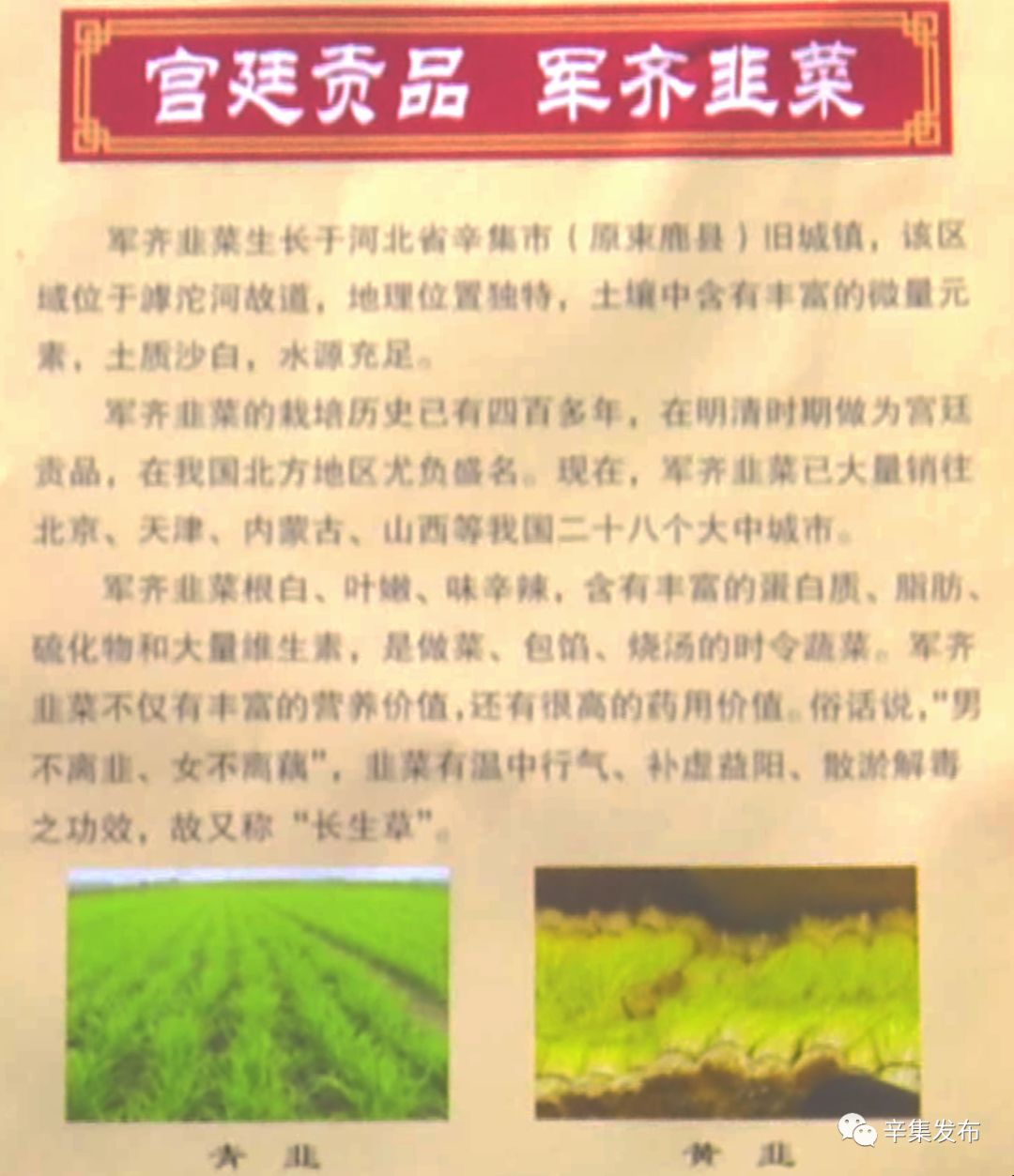 军齐韭菜根白、叶嫩、味辛辣,含有丰富的蛋白质、脂肪、硫化物和大量维生素,是做菜、包馅、烧汤的时令蔬菜,不仅有丰富的营养价值,还有很高的药用价值。俗话说,“男不离韭、女不离藕”,韭菜有温中行气、补虚益阳、散淤解毒之功效,故又称“长生草”。