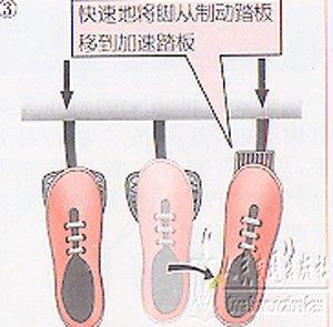 右脚踩住制动踏板,左脚将离合器踏板控制在半离合状态。   右脚制动踏板快速地移到加速踏板(这时稍稍用力踩踏加速踏板)。 车辆起动后,半离合状态下的离合器踏板轻轻回位。 3.在坡道上行驶时发动机熄火的处理方法 行驶在坡道上的动机熄火时,驾驶员非常容易紧张,应沉着操作。首先将车制动,不要下车,用正确的步骤重新起动发动机。